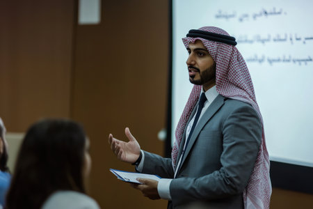 An Arab businessman presenting speech at conference, engaging audience