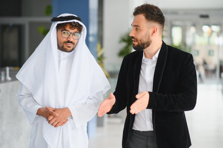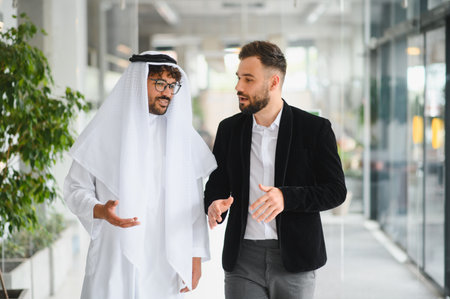 Two businessmen, one in traditional Arab clothing and the other in western attire, are walking and talking together in a modern office building