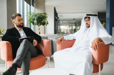 International operations manager having a discussion with a Saudi business partner wearing a traditional kandura in a modern office environment