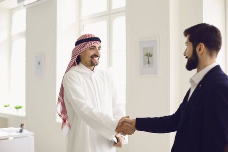 Business meeting with arab man and shaking each other hands in greetings and introduction discussing and planning within modern office in background