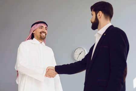 Handshake of arabic and european businesspeople. Businessman hands makes a handshake in the office. The conclusion of the contract by business people.