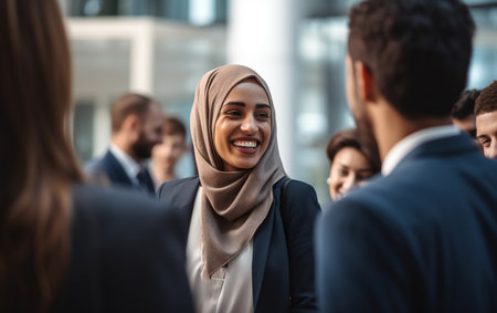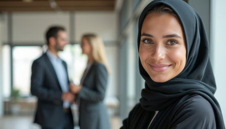 A poised woman wearing a stylish hijab beams with confidence, standing in a modern office setting. Behind her, two colleagues engage in conversation, highlighting a collaborative and professional atmosphere.