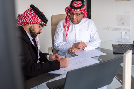 arabic males working on project using laptop and papers while talking and checking all possibilities to enhance outcomes