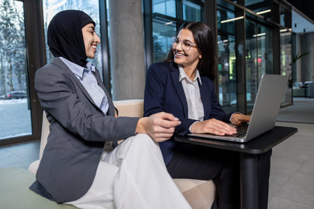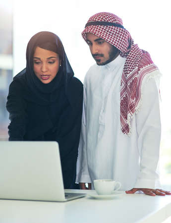Time to produce results. Shot of two muslim coworkers using a laptop together in a modern office.