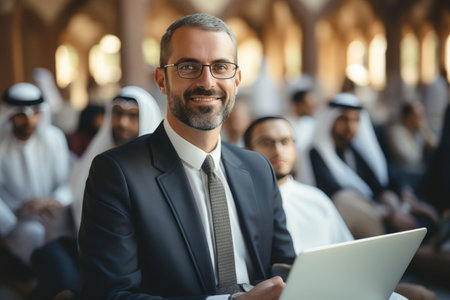 An Arab businessman leading workshop at networking conference, engaging with participants and sharing insights