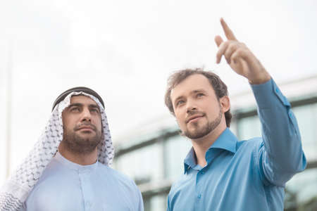 Discussing business issues. Low angle view of two business partners discussing something while one of them pointing away and smiling