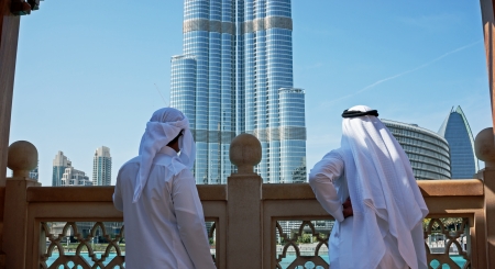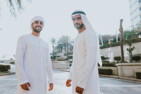 Two young businessmen going out in Dubai. Friends wearing the kandura traditional male outfit walking in Marina