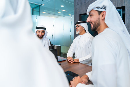 Group of corporate arab businessmen meeting in the office - Middle-eastern businesspeople wearing emirati kandora working in a meeting room, Dubai