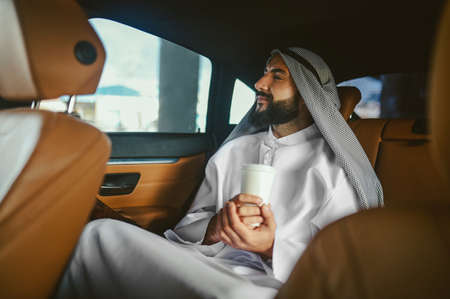 Handsome man with uae traditional outfit driving in Dubai. Middle eastern man with kandura in the car