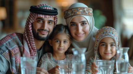 A happy Muslim family of four celebrating Iftar dinner together, smiling and sharing a moment over glasses of water