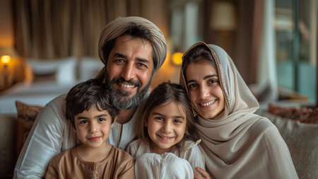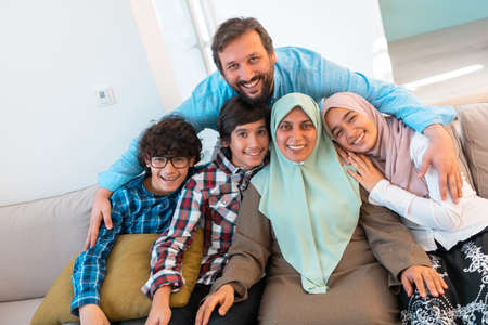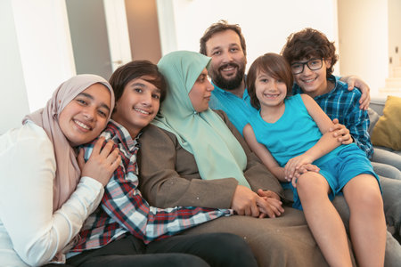 Portrait photo of an arab muslim family sitting on a couch in the living room of a large modern house. Selective focus