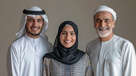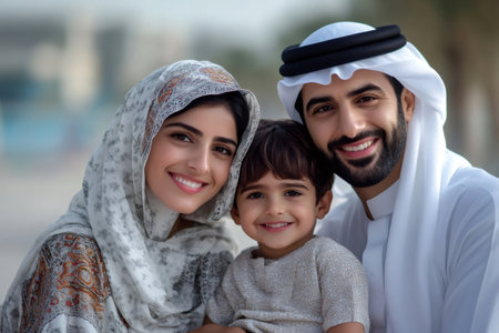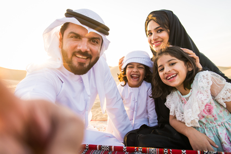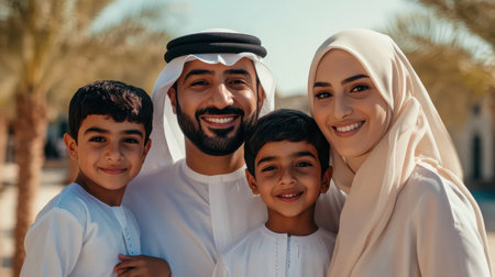 Smiling Emirati family in traditional clothing enjoying time together