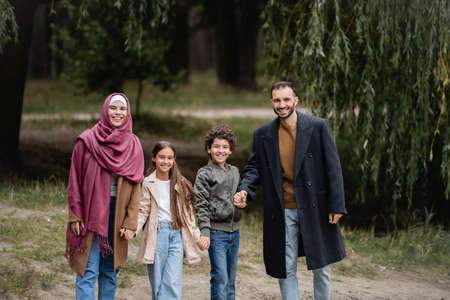 Cheerful muslim parents walking near kids in park in autumn