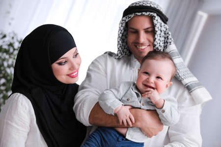 Happy Muslim family with little son indoors