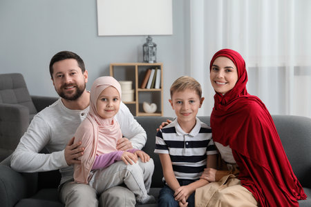 Happy Muslim family sitting on sofa at home