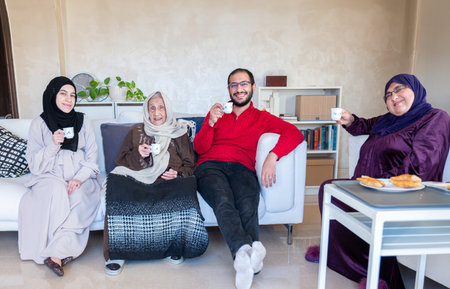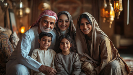 Saudi family gathered in cozy living room adorned with Ramadan decorations. Grandpa, grandma, father, mother, and two kids, all sitting in traditional attire.