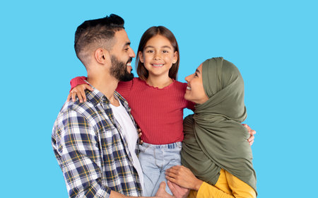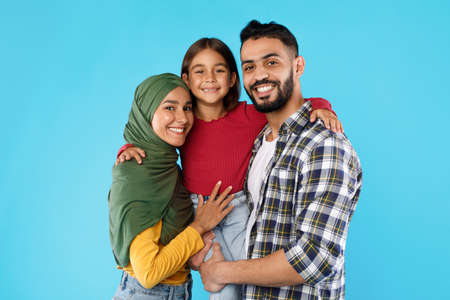 Muslim Parents Embracing Little Daughter Posing Together Over Blue Background
