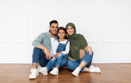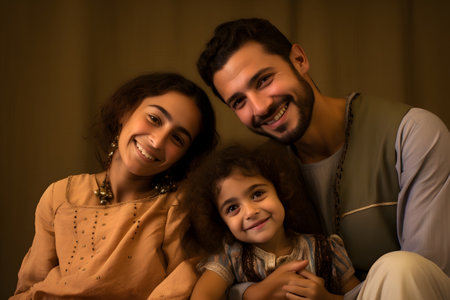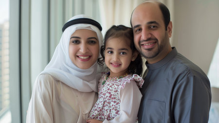 Photo of happy Arabic parents posing with their little daughter