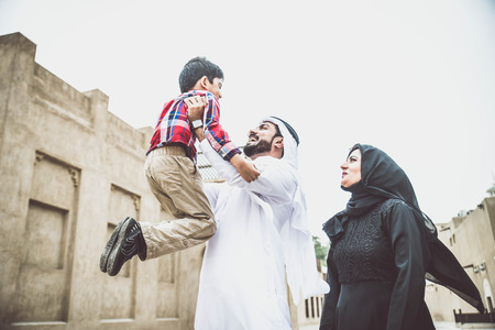 happy arabian father and son outdoors