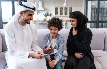 Happy family spending time together. Arabian parents and kid celebrating his birthday together