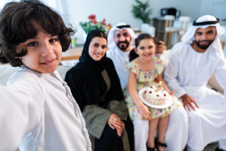 Happy arab family wearing emirati clothing spending time together at home - Middle-eastern parents and children bonding in modern apartment in Dubai celebrating birthday