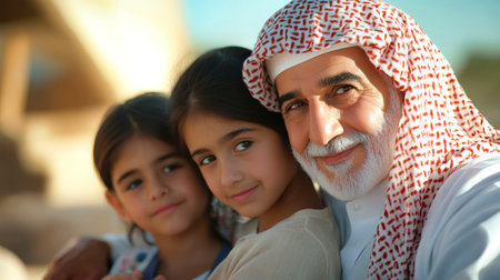 Elder man with two children in Jeddah traditional attire, highlighting cultural heritage and bonds