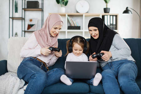 Old muslim granny, young mom in hijab and little cute girl with headphone playing video games at home, sitting on sofa with laptop and using joysticks.
