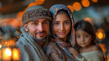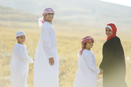 Happy arabic family smiling outdoors in traditional clothes