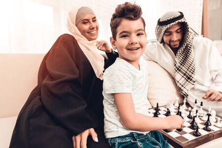 Arabian Boy Playing Chess with Father at Home. Healthy Lifestyle Concept. Smiling Mother. Muslim Family. Smiling Boy at Home. Young Arabian Man. Board Game. Father and Son. Indoor Fun.