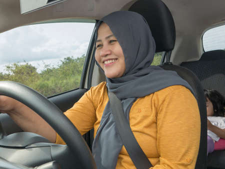 Portrait of young Asian muslim woman smiling and driving a car, good looking entrepreneur, car sharing concept