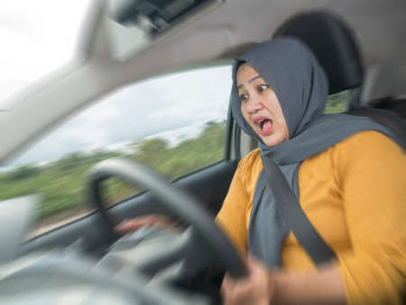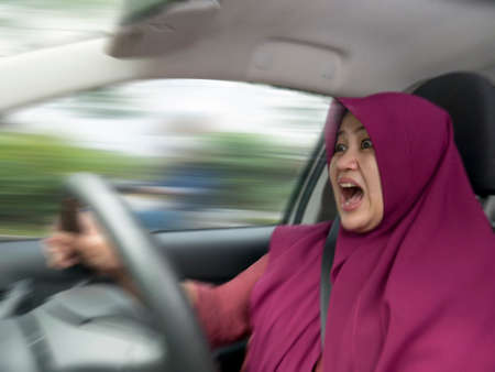 Portrait of Asian muslim female driver mad of trapped in traffic jam, mischievous reckless way of driving concept with motion blur
