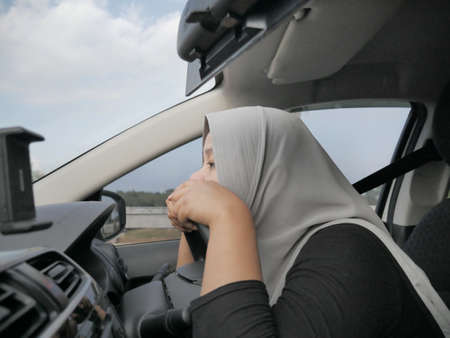 Portrait o Asian muslim lady slept in her car, tired in the trip, taking nap by the side of the road