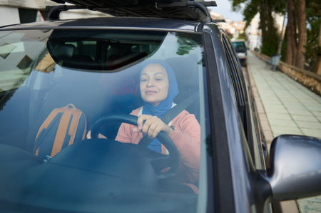 A hijab-wearing woman sits behind the wheel of a gray car, navigating urban streets. She embodies daily life, independence, and contemporary culture for Arab women in Europe.