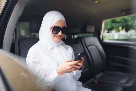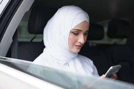 Beautiful muslim woman wearing white hijab sitting on the back seat of a car and using smartphone