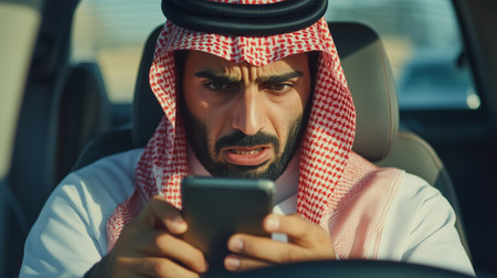 A focused man in traditional attire checks his phone while seated in a car during the day