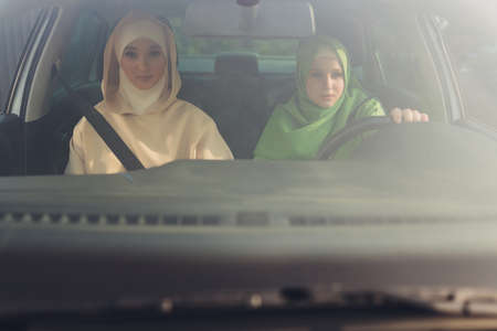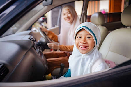 muslim smiling mother taking her daughter to school by car