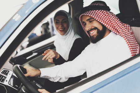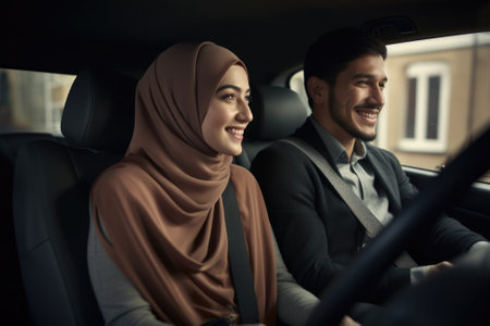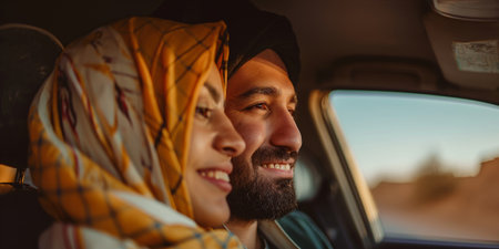 Side View Shot Of Happy Young Muslim Couple Enjoying Car Ride Together