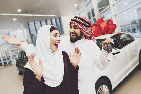 Man and his wife are sitting in new car.