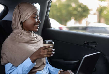 Cheerful Black Muslim Lady In Hijab Drinking Takeaway Coffee In Car On Her Way To Work, Sitting On Back Seat With Laptop And Looking From Window, Enjoying City View, Riding Taxi, Side View, Free Space
