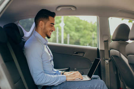 Young arab man CEO working at car backseat, using laptop