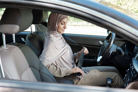 Horizontal shot of modern Muslim woman wearing hijab sitting in her car buckling seatbelt before starting driving