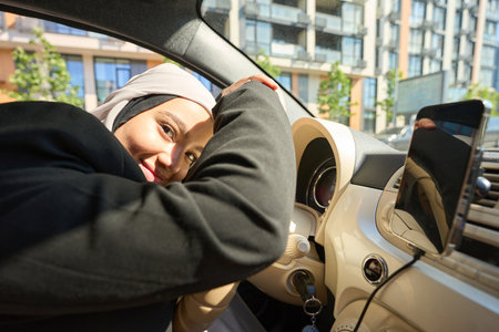 portrait of young muslim woman in hijab sitting on car seat with opened door. Female driver concept.