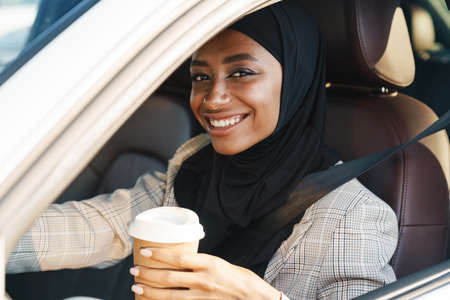 Black muslim woman wearing headscarf drinking coffee while driving car