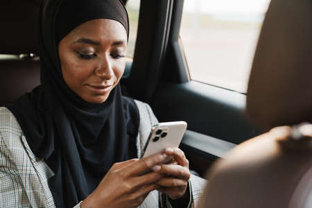 Black muslim woman wearing headscarf using cellphone while going in car