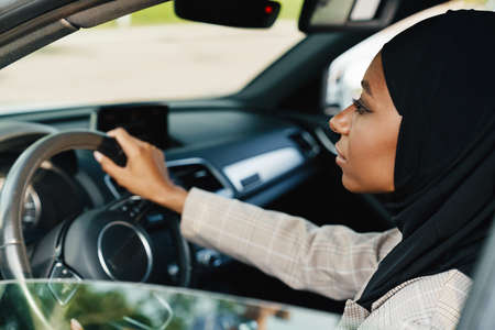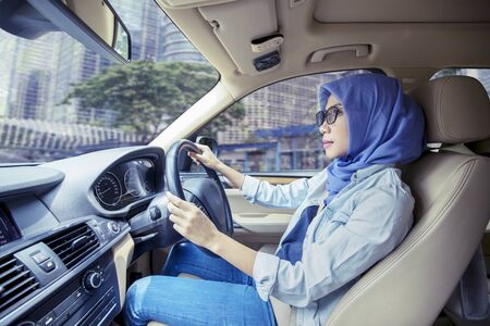 Pretty young muslim woman driving her new car on the road in the city