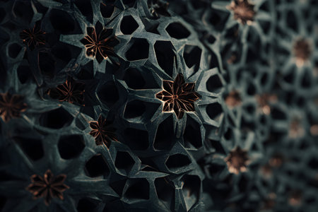 Close-up of a gold ornament with intricately geometric patterns. The detail shows the craftsmanship of the piece, showcasing its elegance and sophistication.