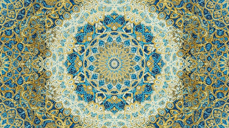 Close-up of a detailed Islamic tile pattern featuring gold, blue, and brown colors.