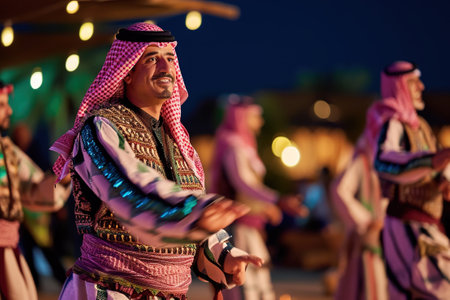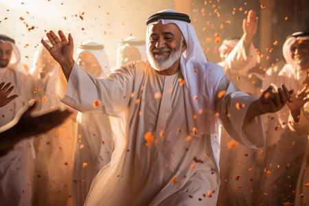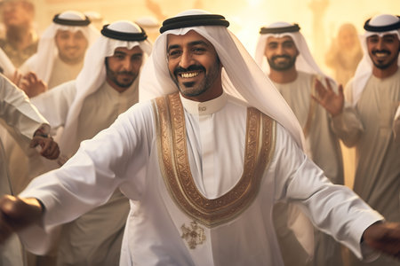 Group of Muslim people wearing traditional clothes at the celebration of Ramadan Kareem.