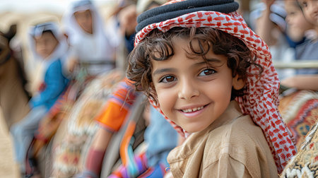 a camel encounter for children in Saudi Arabia, where laughter and excitement fill the air as children revel in the unique experience, while spectators observe with delight
