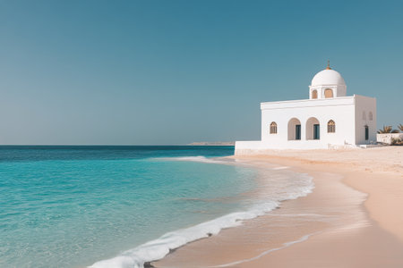 Clear skies and gentle waves create a tranquil atmosphere at this beach, featuring a stunning white structure set against the vibrant blue sea and soft sand.